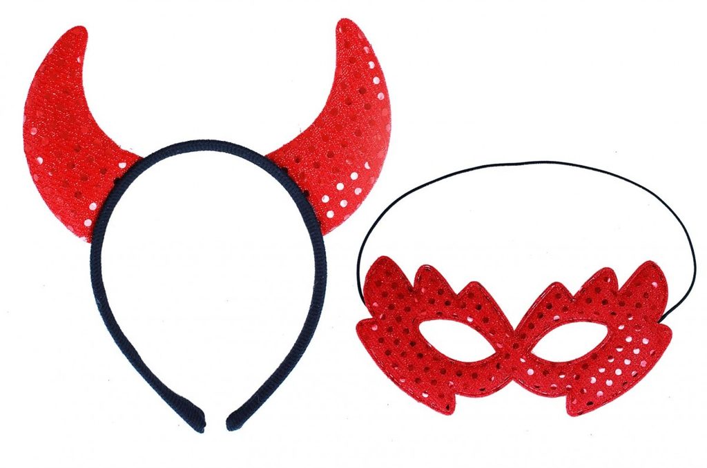 Karnevalová maska čerta s flitry. Balení obsahuje oční masku a čelenku s rohy.
