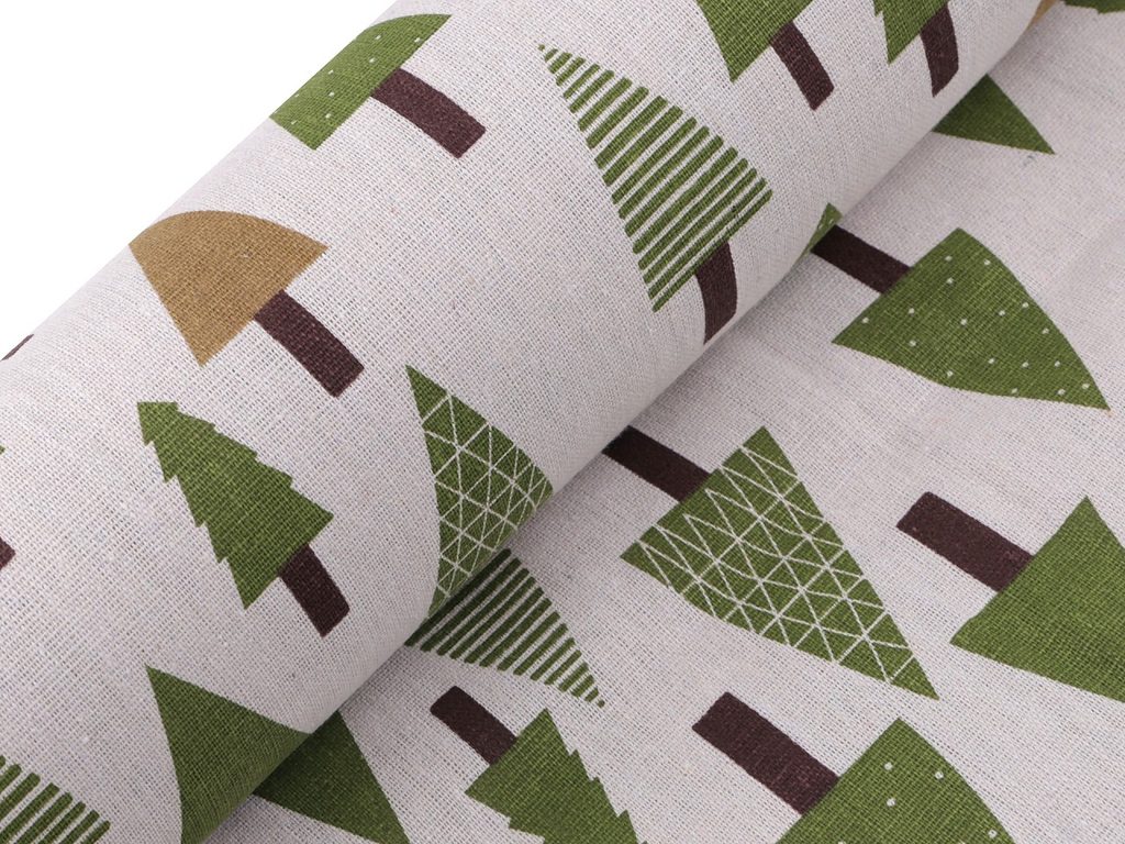 Hrubší bavlněná látka s motivem stromečků svou plátnovou vazbou imituje látky ze lnu. Využijete ji na šití ubrusů, běhounů, prostírání nebo dekoračních polštářů. Látka je vhodná také k šití mikulášských pytlíčků. Je oblíbená i na dětské teepee.- Gramáž:: 180 g/m²