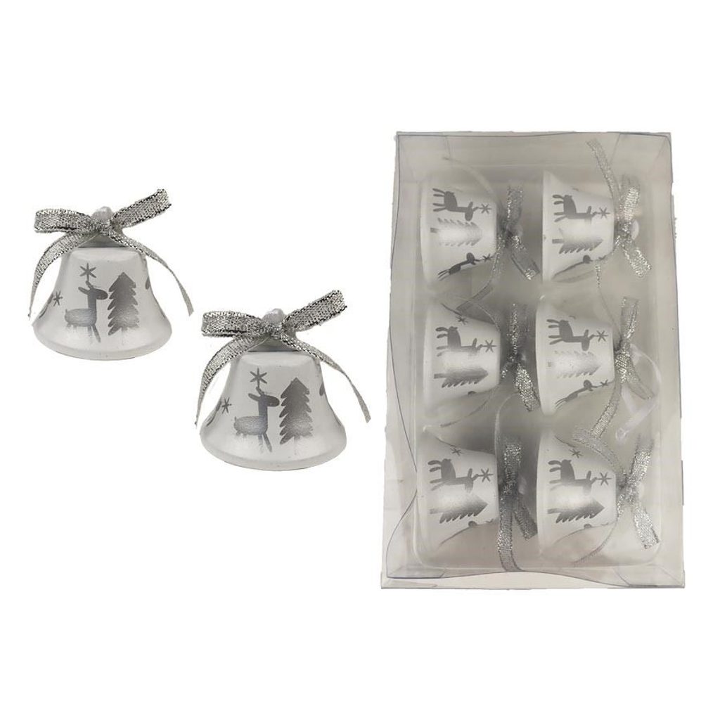 Sada dekoračních zvonečků k zavěšení. Sada obsahuje 6 zvonečků. Rozměry : průměr 4,8 cm, výška 4,5 cm. Barva : kombinace bílá s šedou. Materiál : kov.