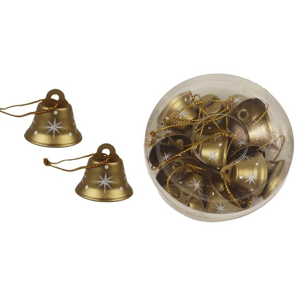 Sada dekoračních zvonečků k zavěšení. Sada obsahuje 12 zvonečků. Rozměry : průměr 2,5 cm, výška 2,5 cm. Barva : zlatá. Materiál : kov.- Rozměr: dia 2,5 x 2,5 cm