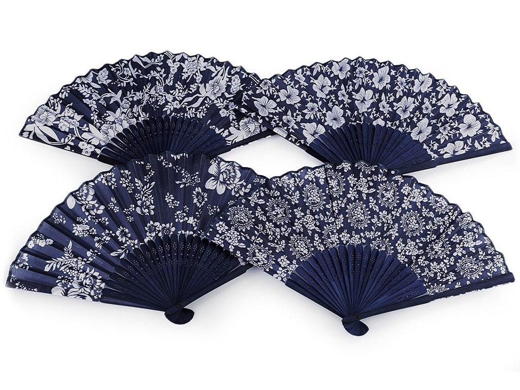 Vějíř využijete na společenské události i na karnevaly. Zdobí ho květinový potisk. Má dřevěnou rukojeť s vyřezanými ornamenty.Květinový potisk se může lišit.