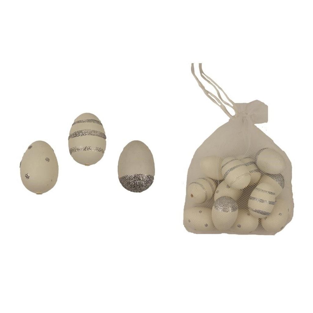 Sada dekoračních vajíček. Sada obsahuje 12 vajíček. Rozměry : 2,4 x 3,5 cm. Barva : kombinace bílá s šedou. Materiál : plast.