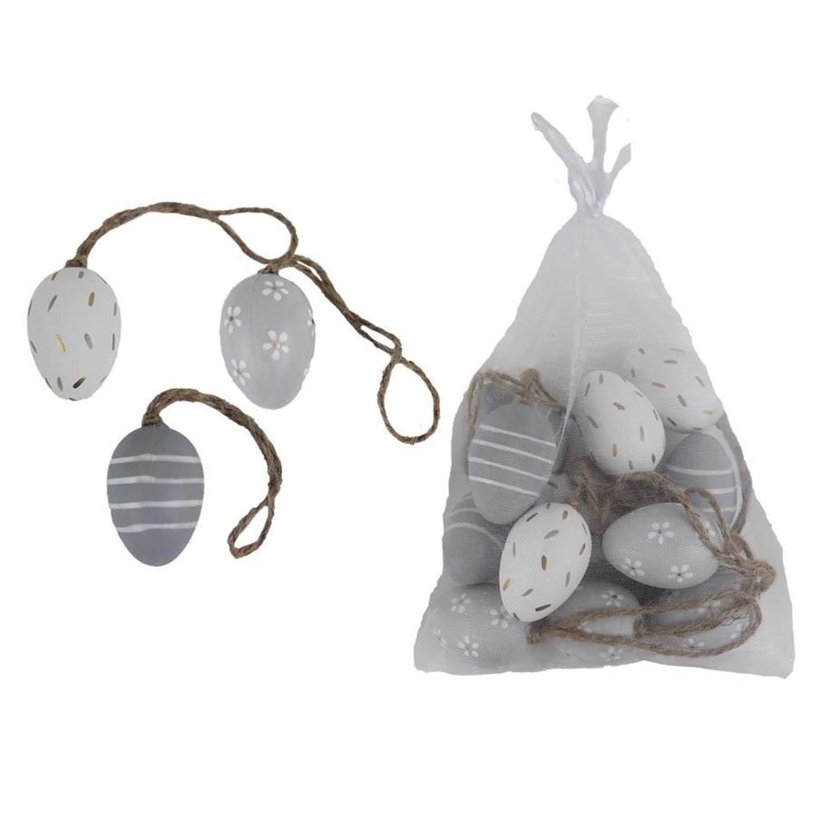 Sada dekoračních vajíček k zavěšení. Sada obsahuje 12 vajíček. Rozměry : průměr 3 cm, výška 4 cm. Barva : kombinace šedá s bílou. Materiál : plast.