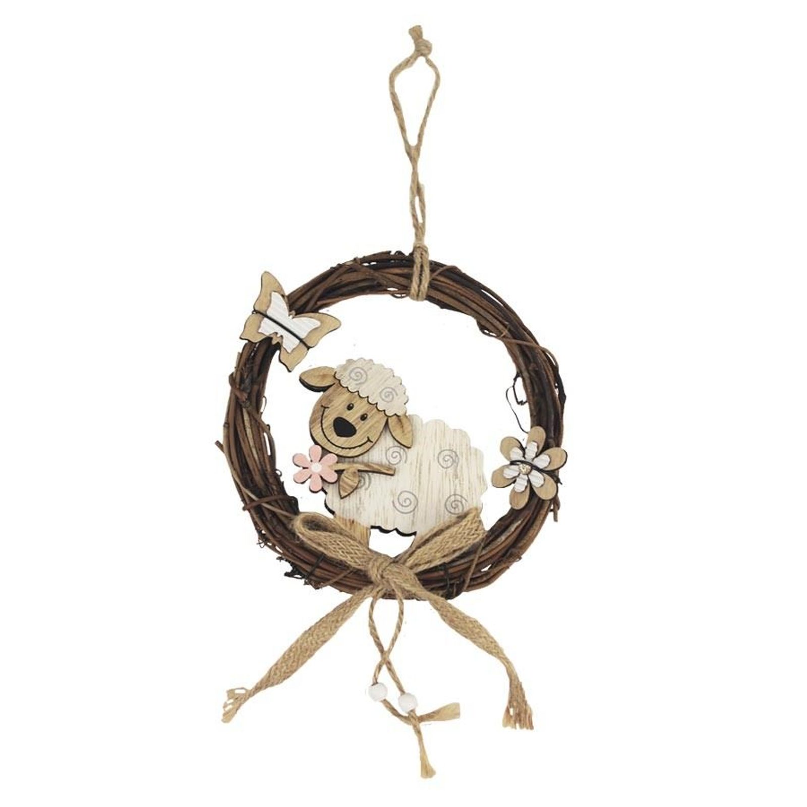 Dekorační věneček k zavěšení. Rozměry : průměr 15 cm, tloušťka 2,5 cm. Barva : kombinace hnědá, bílá. Materiál na bázi dřeva, přírodní, stuha z juty.Podobné produkty z kategorie VELIKONOČNÍ DEKORACE ►