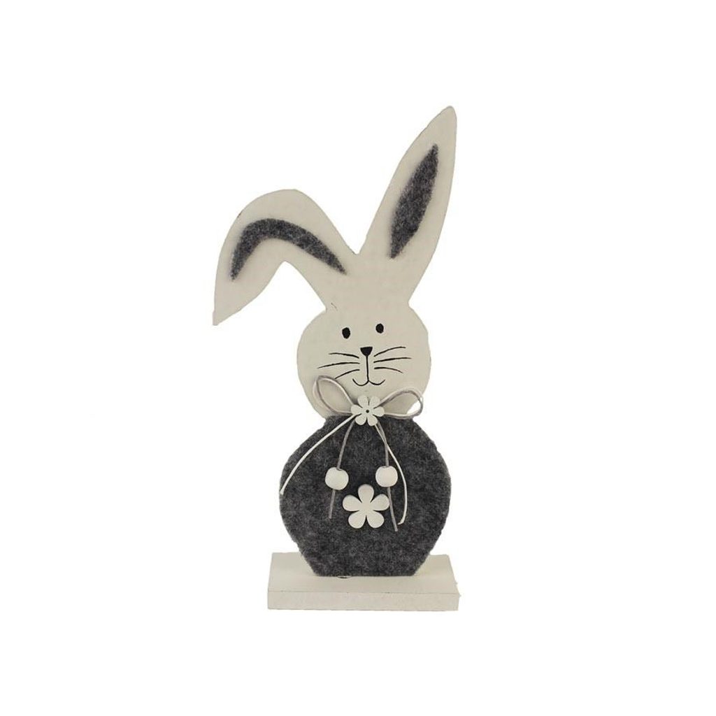 Dekorační zajíc. Rozměry : 11 x 4,5 cm, výška 23 cm. Barva : kombinace bílá s šedou. Materiál na bázi dřeva, textil.Podobné produkty z kategorie VELIKONOČNÍ DEKORACE ►