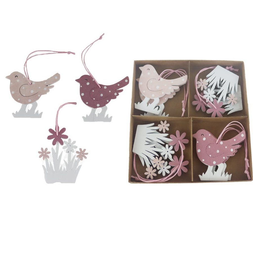Sada jarních dekorací k zavěšení. Sada obsahuje 8 dekorací. Rozměry : 5 - 6 x 0,4 cm, výška 5 - 6 cm. Barva : kombinace bílá, růžová, starorůžová. Materiál na bázi dřeva.