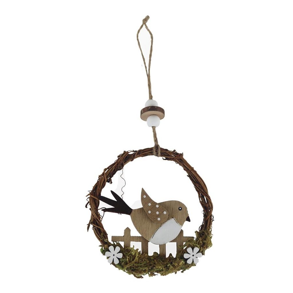 Jarní dekorace k zavěšení. Rozměry : průměr 11 cm, tloušťka 1,5 cm. Barva : hnědá. Materiál na bázi dřeva, přírodní.Rozměr: dia 11 × 0 x 25 cm
