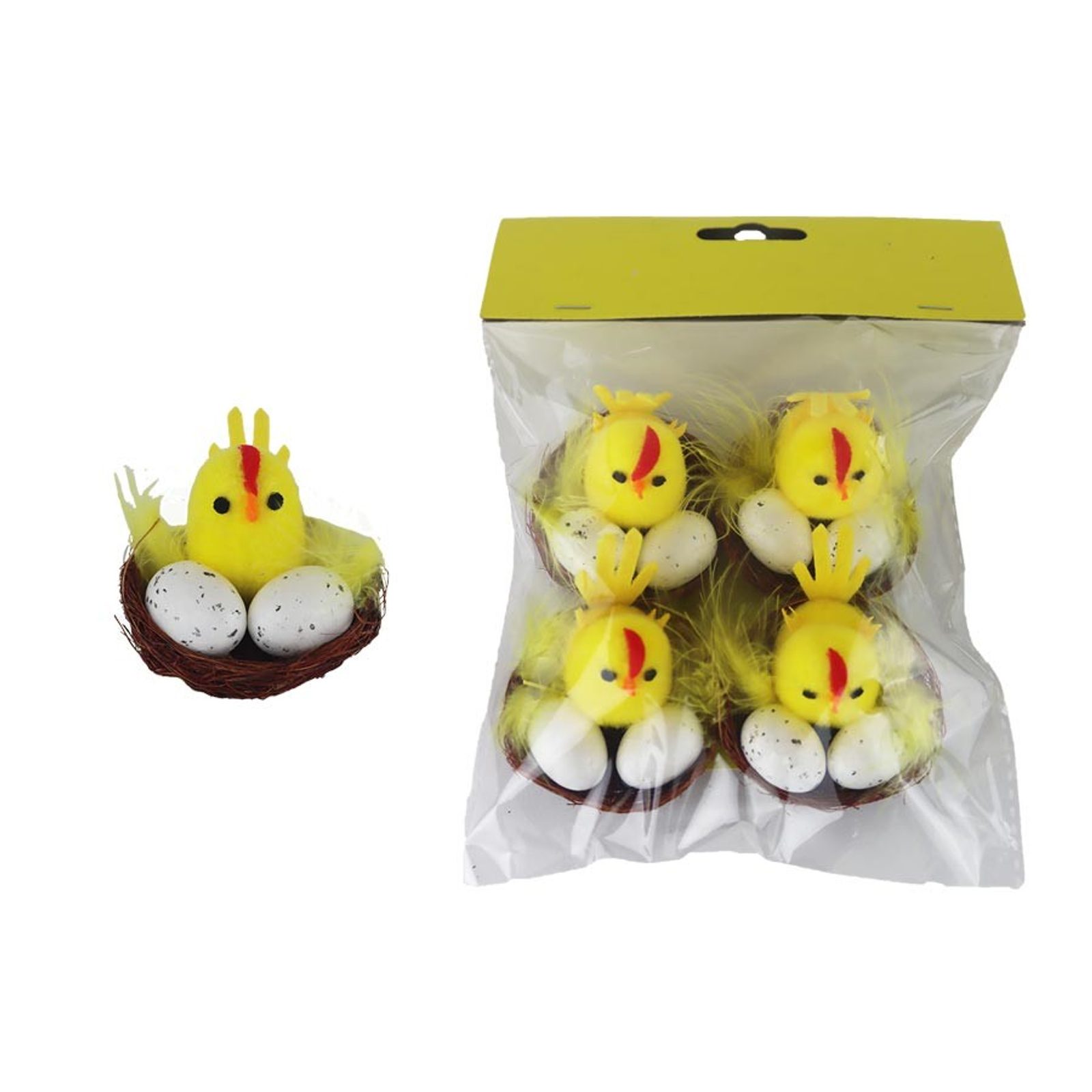 Velikonoční dekorace slepička s vajíčky v hnízdě. Sáček obsahuje 4 dekorace. Rozměry : průměr 5 x 4,5 cm. Barva : kombinace žlutá, bílá, přírodní. Materiál : přírodní, plast, pěna.