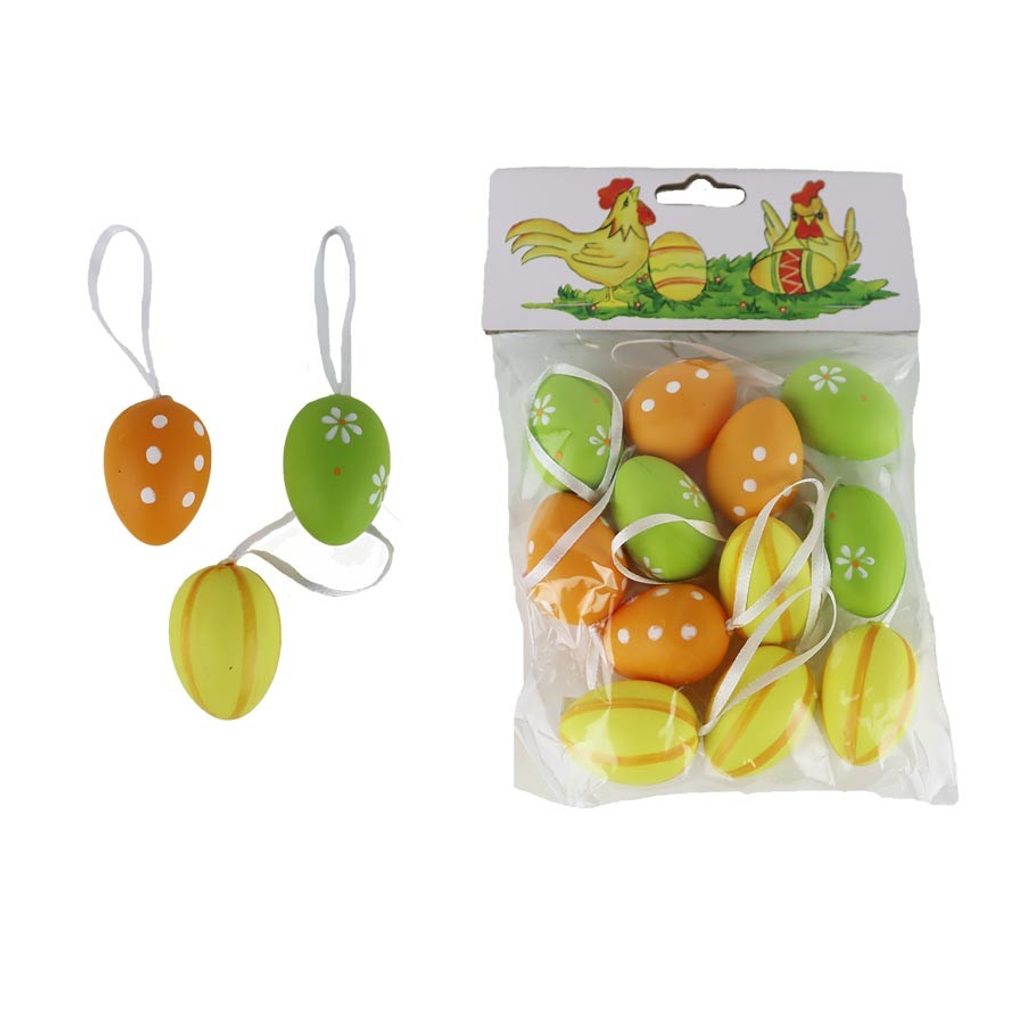 Sada dekoračních vajíček k zavěšení. Sada obsahuje 12 vajíček. Rozměry : průměr 3 cm, výška 4 cm. Barva : kombinace oranžová, zelená, žlutá. materiál : plast.