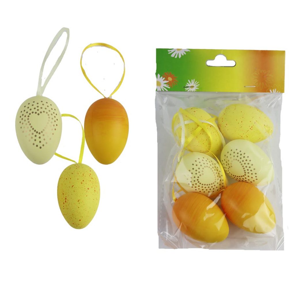 Sada dekoračních vajíček k zavěšení. Sada obsahuje 6 vajíček. Rozměry : průměr 4 cm, výška 6 cm. Barva : kombinace žlutá, oranžová, bílá. Materiál : plast.