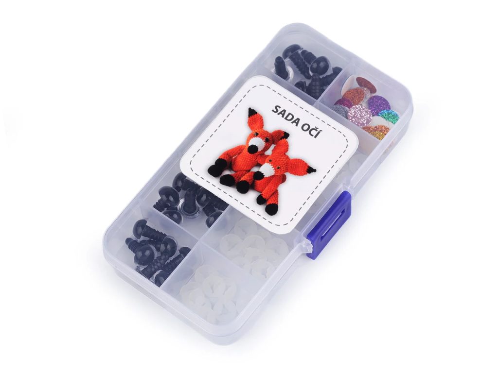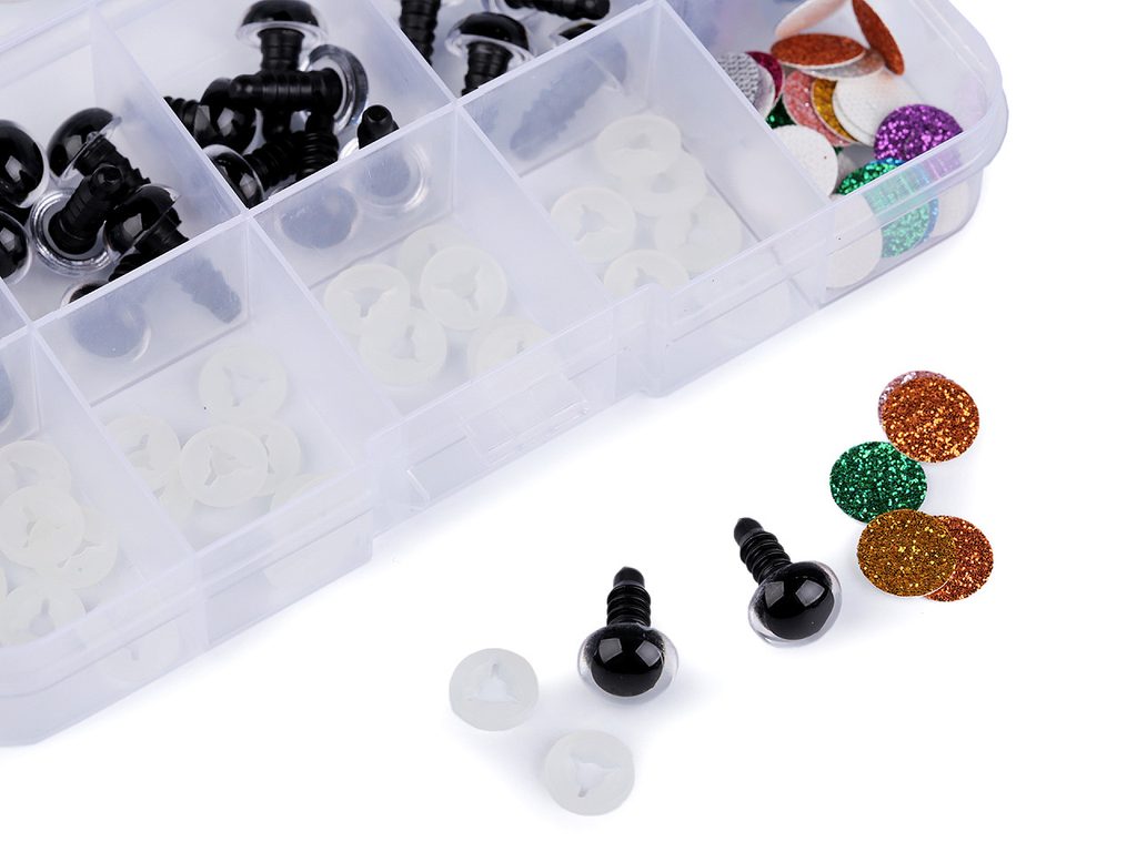 Souprava bezpečnostních očí s glitrovou duhovkou je ideální pro kreativce, kteří rádi vyráběji zvířátka a dekorační postavičky. Oči se nádherně třpytí, umocní výraz ve tváři. Mají závit, na který se nasadí duhovka, následně se provleče materiálem, a z druhé strany se pak nacvakne pojistka, která oči bezpečně připevní na místo. Pokud nebudete chtít, aby se oči třpytily, nemusíte duhovku použít, v tom případě zůstane duhovka transparentní.Vše je roztříděné a uložené v praktické krabičce s přihrádkami.
