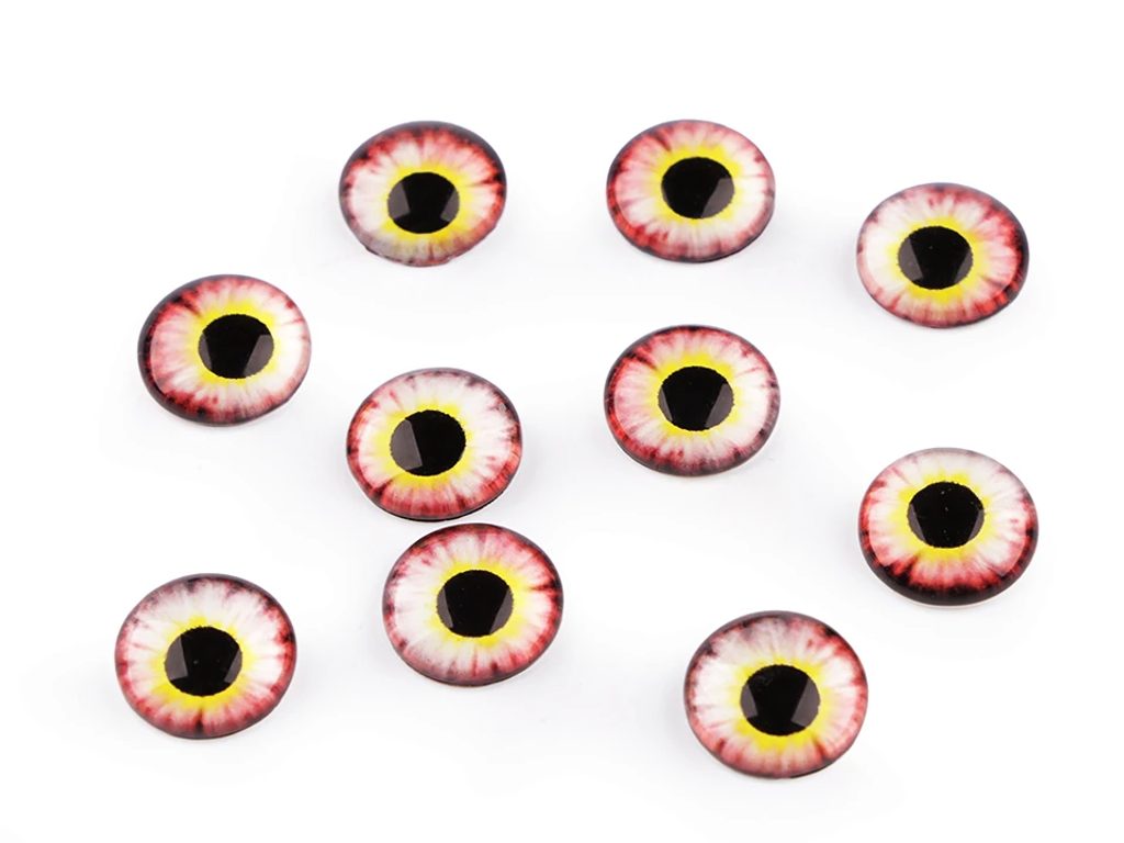 Skleněné kulaté oči mají velice realistické zpracování panenky. Díky tvaru vypouklé čočky obrázek oka krásně vynikne. Využijete je na tvorbu různých postaviček a zvířátek. Pro jejich přilepení je vhodné použít lepidlo na lepení kamínků. S oblibou se používají i na výrobu bižuterie, jako kabošony jsou vhodné k nalepení do kovového lůžka nebo k obšití korálky a rokajlem. Velice působivé jsou v drátovaných špercích.