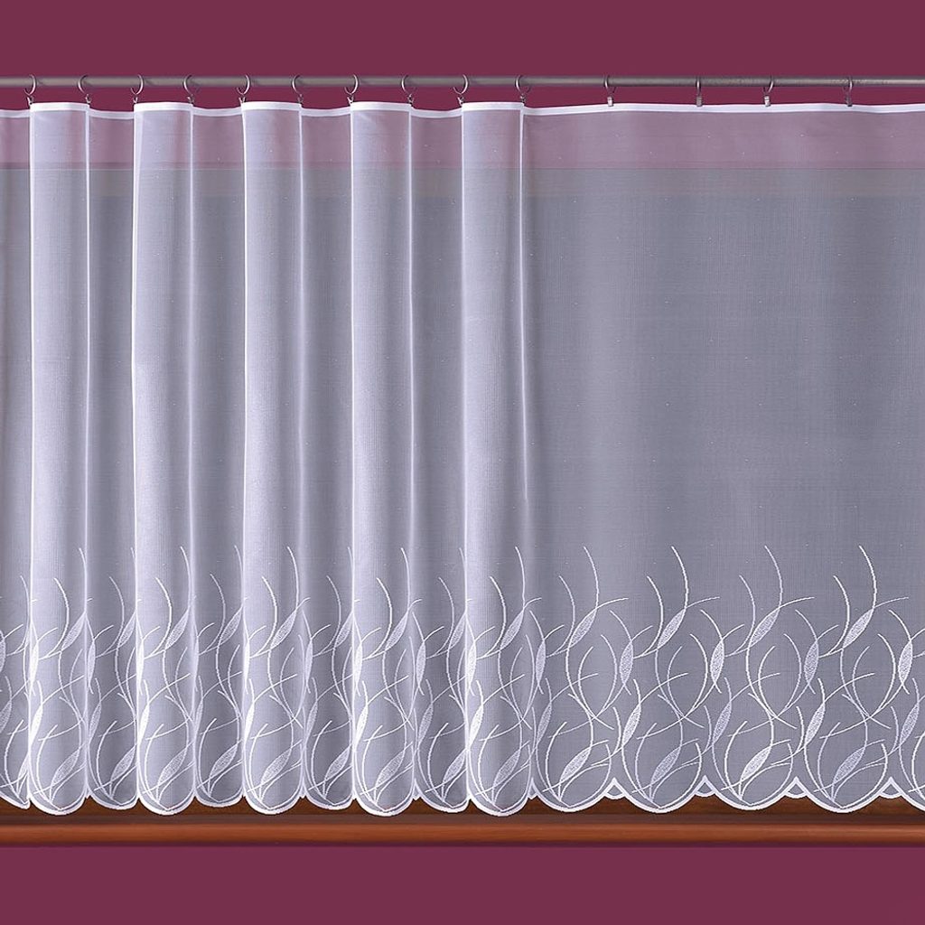 Hotová, jemná bílá žakárová záclona s abstraktním motivem, který ve spodní části vytváří působivou a elegantní borduru. Díky decentnímu vzoru působí na okně velmi vkusně a lehce.