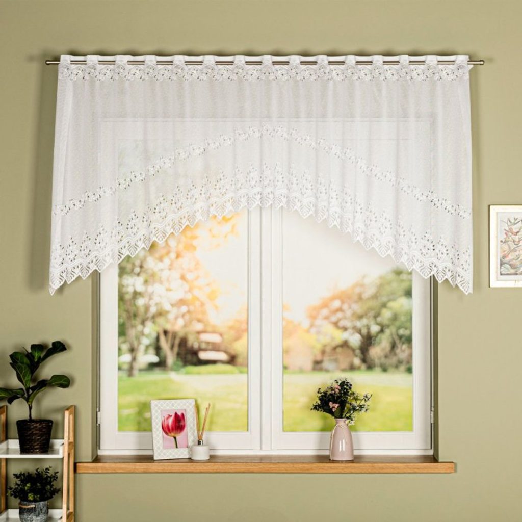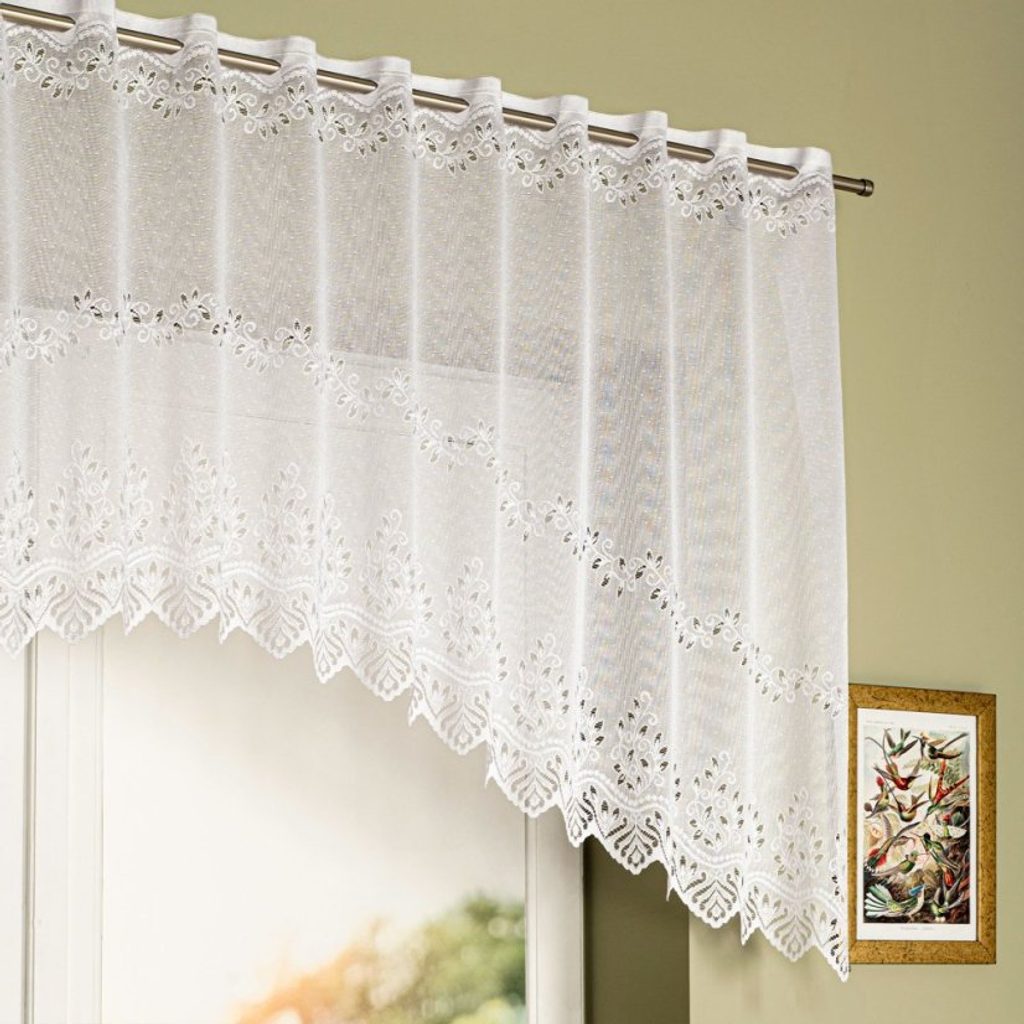 Žakárová záclona tkaná do oblouku s jemným floristickým vzorem. Spodní část má ozdobné, elegantní obloučky. Vrchní část je opatřena očky na zavěšení, které se v případě potřeby můžou i nažabkovat. Záclona se hodí především do kuchyní.