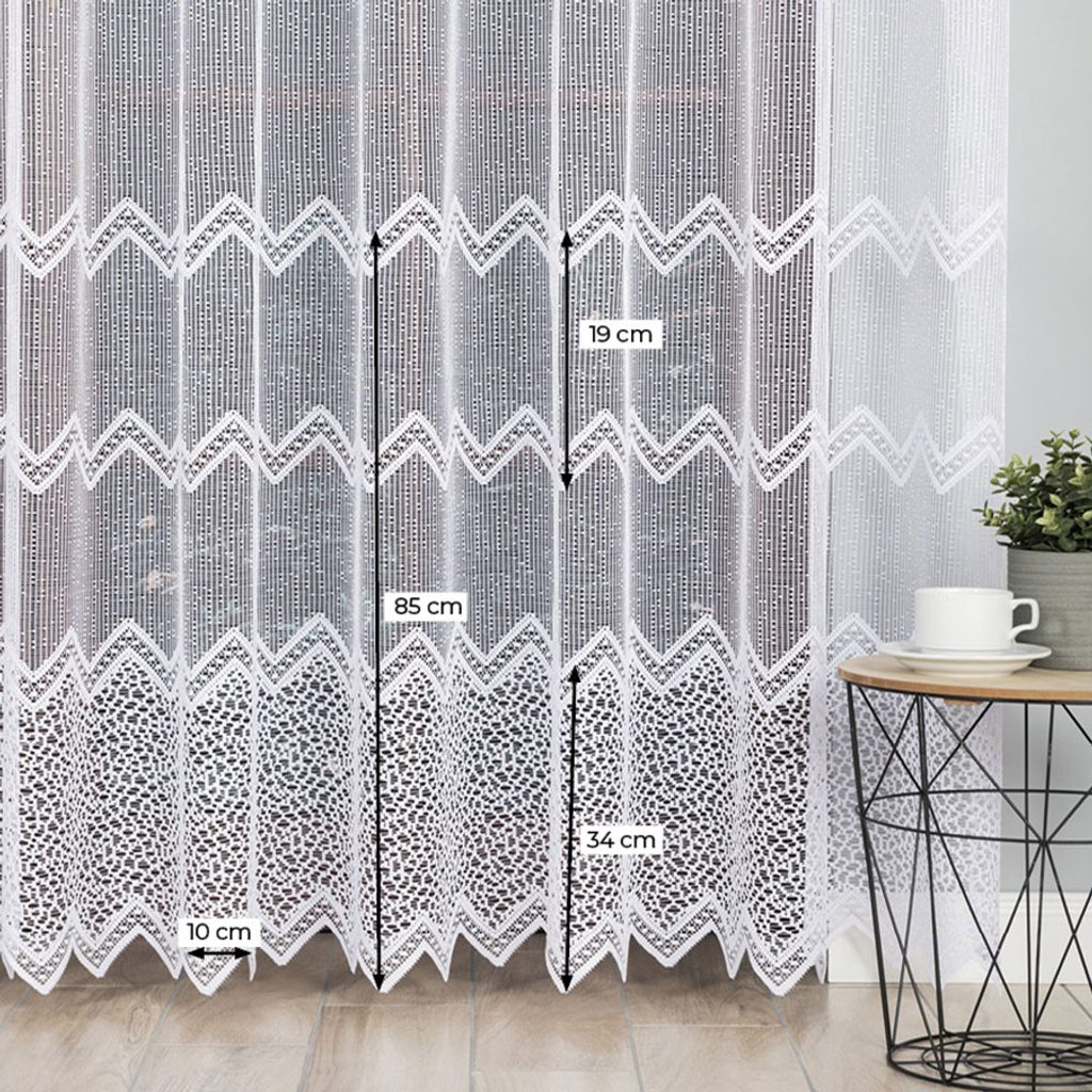 Záclona je v prodeji ve výšce 160, 175 a 250 cm, vhodné také jako balkónový set. Záclona je zakončena do špic, které jí dodají efektivní vzhled. Kusová záclona je opatřena řasící stuhou F1 s pravidelnými sklady 1:2.