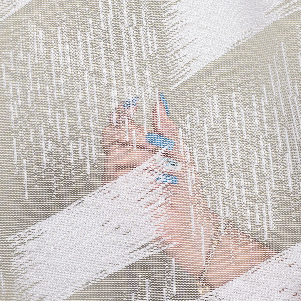 Bílá žakárová záclona s výrazným geometrickým vzorem. Záclona má vzor po celé ploše. Na spodním okraji je zakončena bordurou vln.
