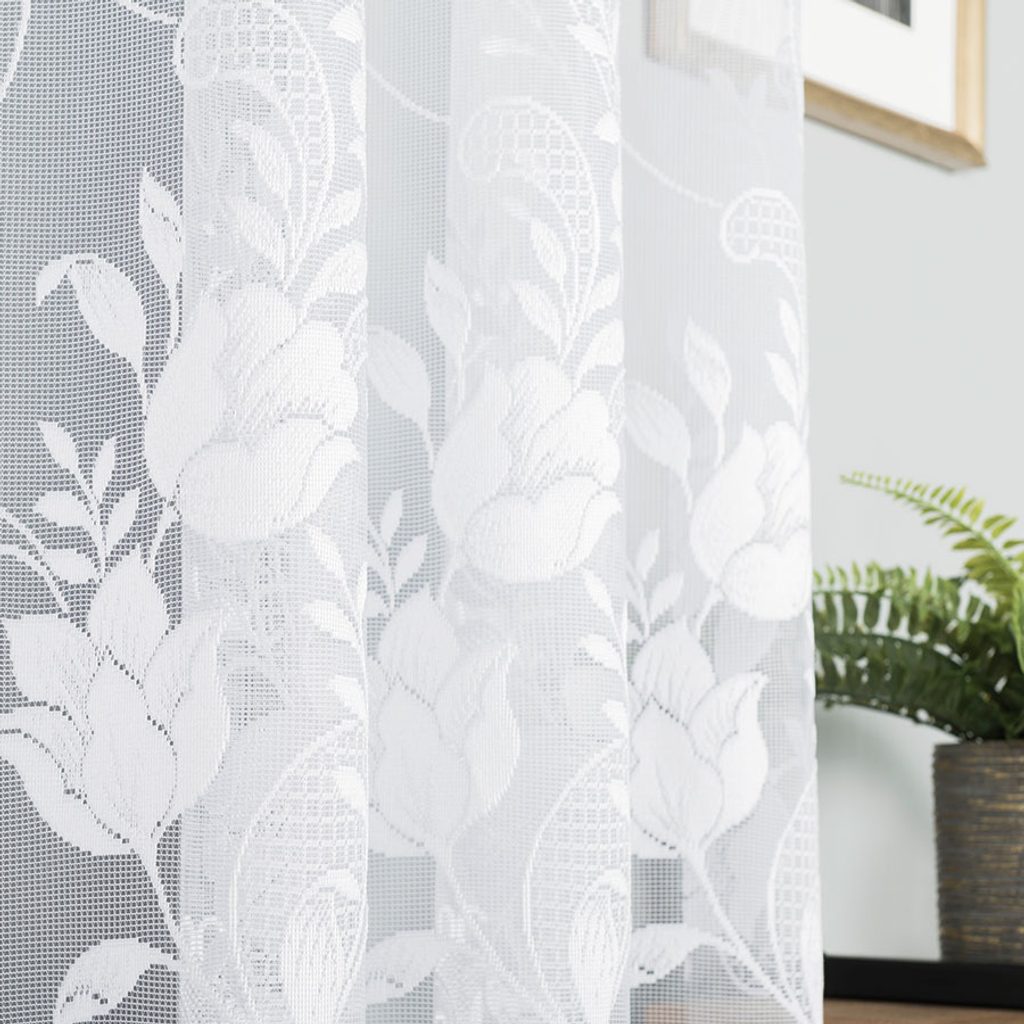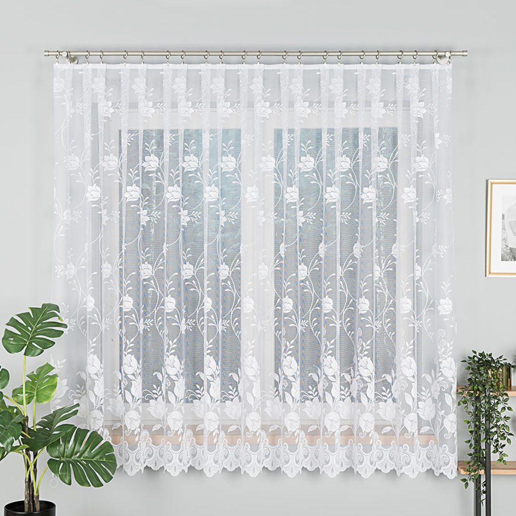 Bohatě zdobena záclona s květinovým motivem krásně vynikne v každém okně a dodá interiéru svěží, vzdušný vzhled. Je dostupná ve výšce 155 cm. Spodní lem zdobí dekorativní vlnky, které zácloně propůjčují originální a efektní charakter. Kusová záclona je opatřena řasící stuhou F1 s pravidelnými sklady 1:2.