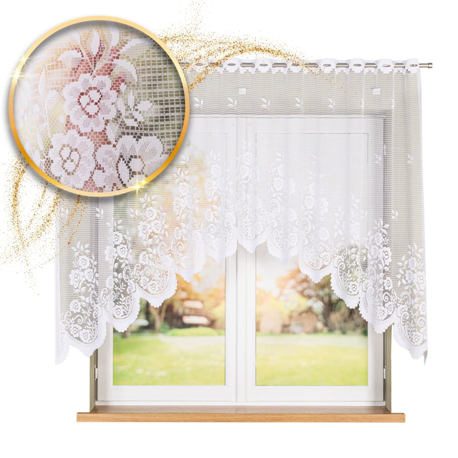Žakárová záclona tkaná do oblouku s floristickým, spodním vzorem. Vrchní část je opatřena očky na zavěšení, které se v případě potřeby můžou i nažabkovat. Záclona se hodí především do kuchyní.