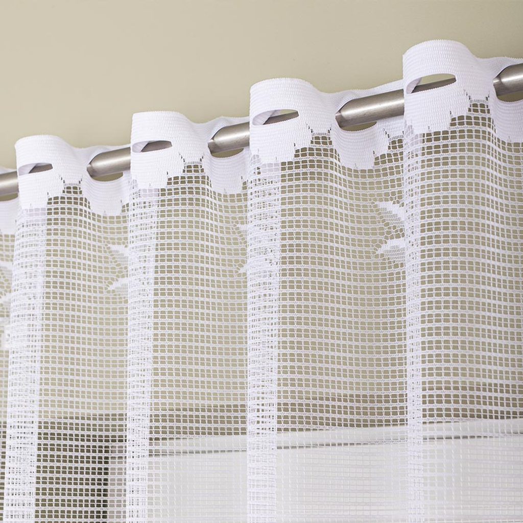 Záclona má na vrchní části vitrážová očka, tudíž není již třeba našívat na vrchní okraj řasící pásku. Očka jsou v rozměru 5x1 cm, ideální na vitrážovou či tenčí tyč.