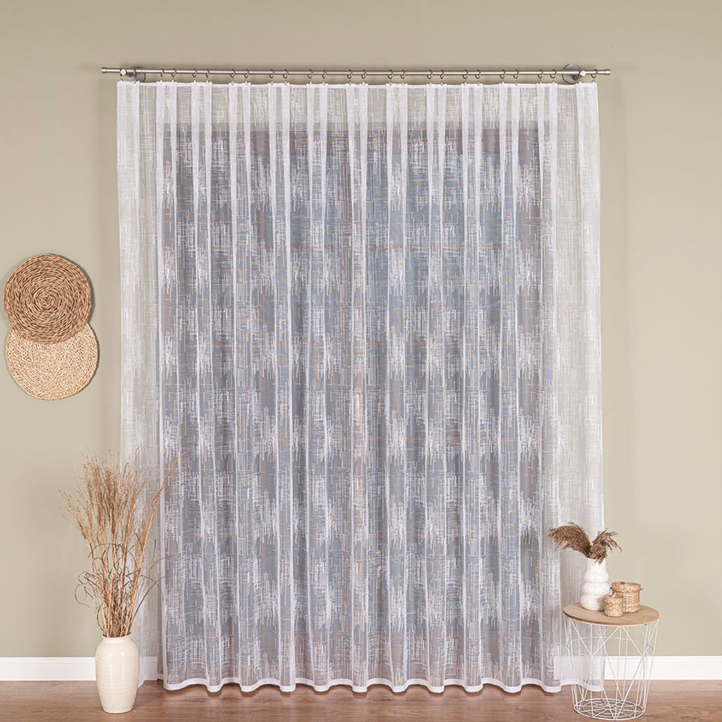 Kusová záclona je opatřena řasící stuhou Z5 s pravidelnými sklady 1:2. Záclona je v prodeji v několika výškách, a proto je vhodná i jako balkonový set.