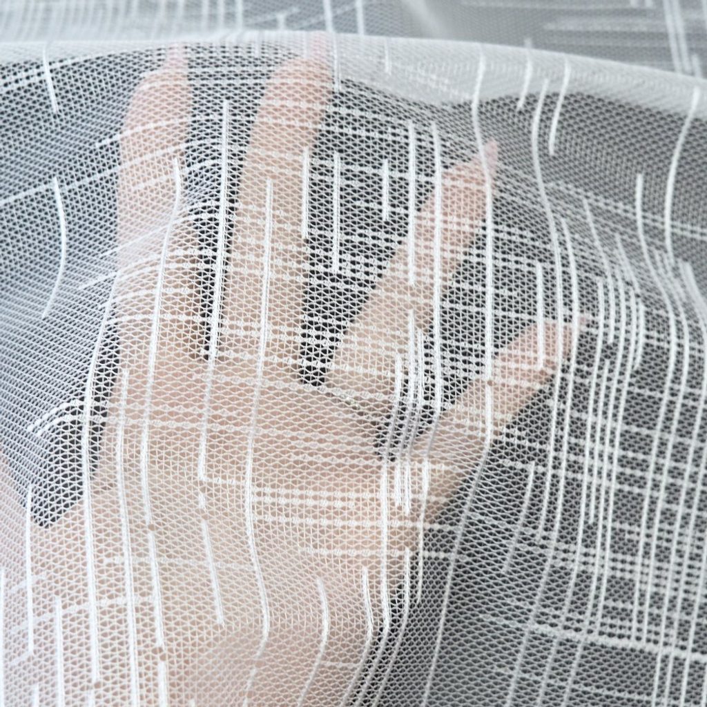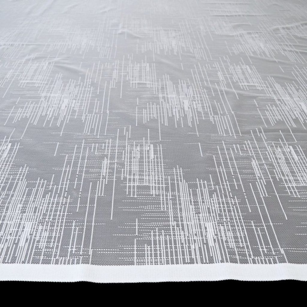 Celoplošná záclona s jednoduchou, čárečkovanou bordurou. Na spodním okraji je zakončena rovně, bez vln.