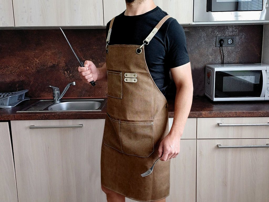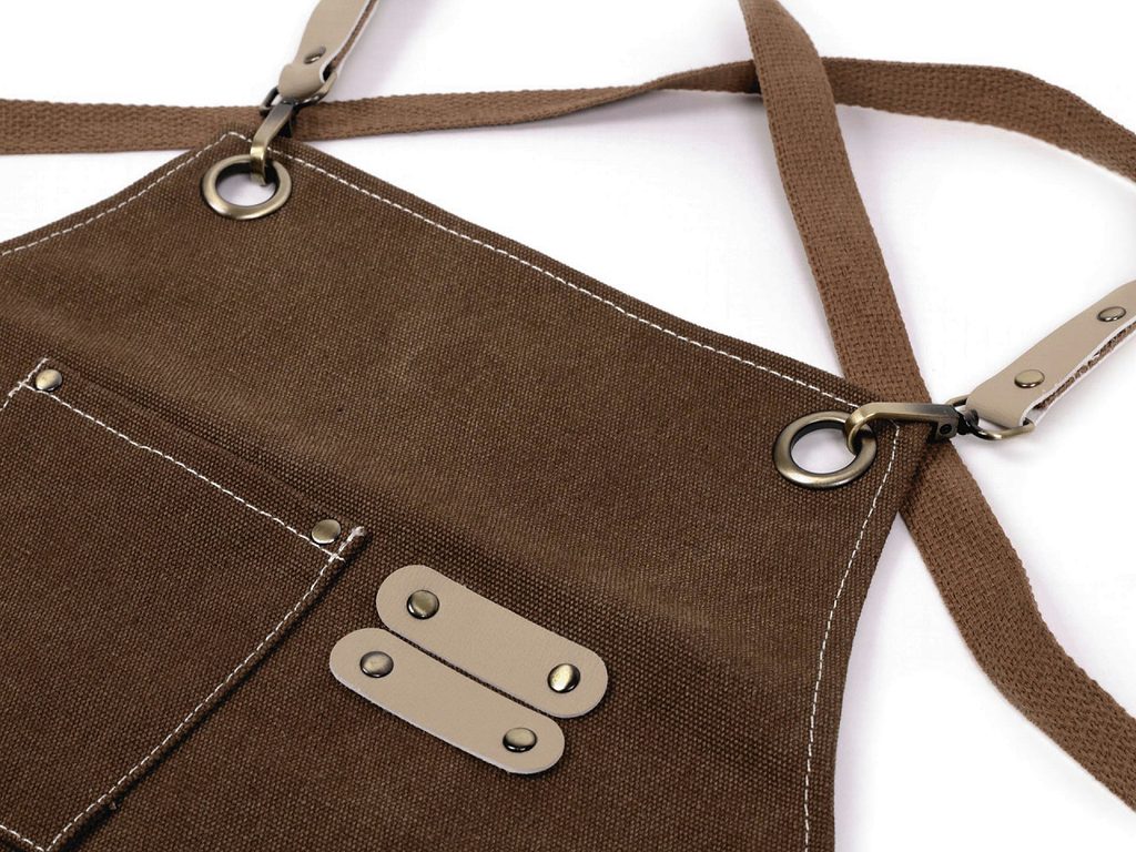 Profesionální zástěra 2v1 je vyrobená z hrubé a velmi pevné bavlny. Díky svému designu ji využijí dámy i pánové. 2v1 - můžete ji nosit za krkem i okolo pasu. Jednoduše odepnete popruh u krku a karabinky zapnete do kovových průvleků k pasu. Zástěra má praktické kapsy. Celkový vzhled a styl doplňují detaily z eko kůže.Zástěru využijí kuchaři a číšníci, ale oceníte ji i na zahradní grilování a různé hobby techniky, kde se můžete zašpinit, např. na výrobu keramiky, malbu, práci s betonem, mozaikou apod.