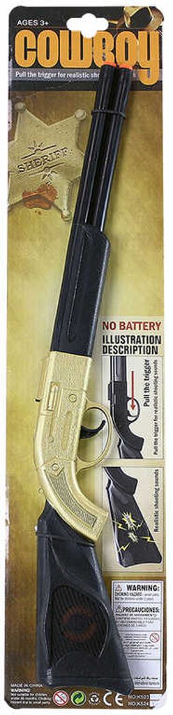 Kovbojská puška nesmí chybět v žádném chlapeckém pokojíčku! Stisknutím spouště vydává puška zvuk výstřelu a to bez použití baterií. Senzace! Baleno na kartě.