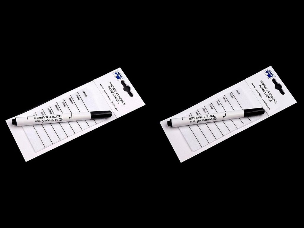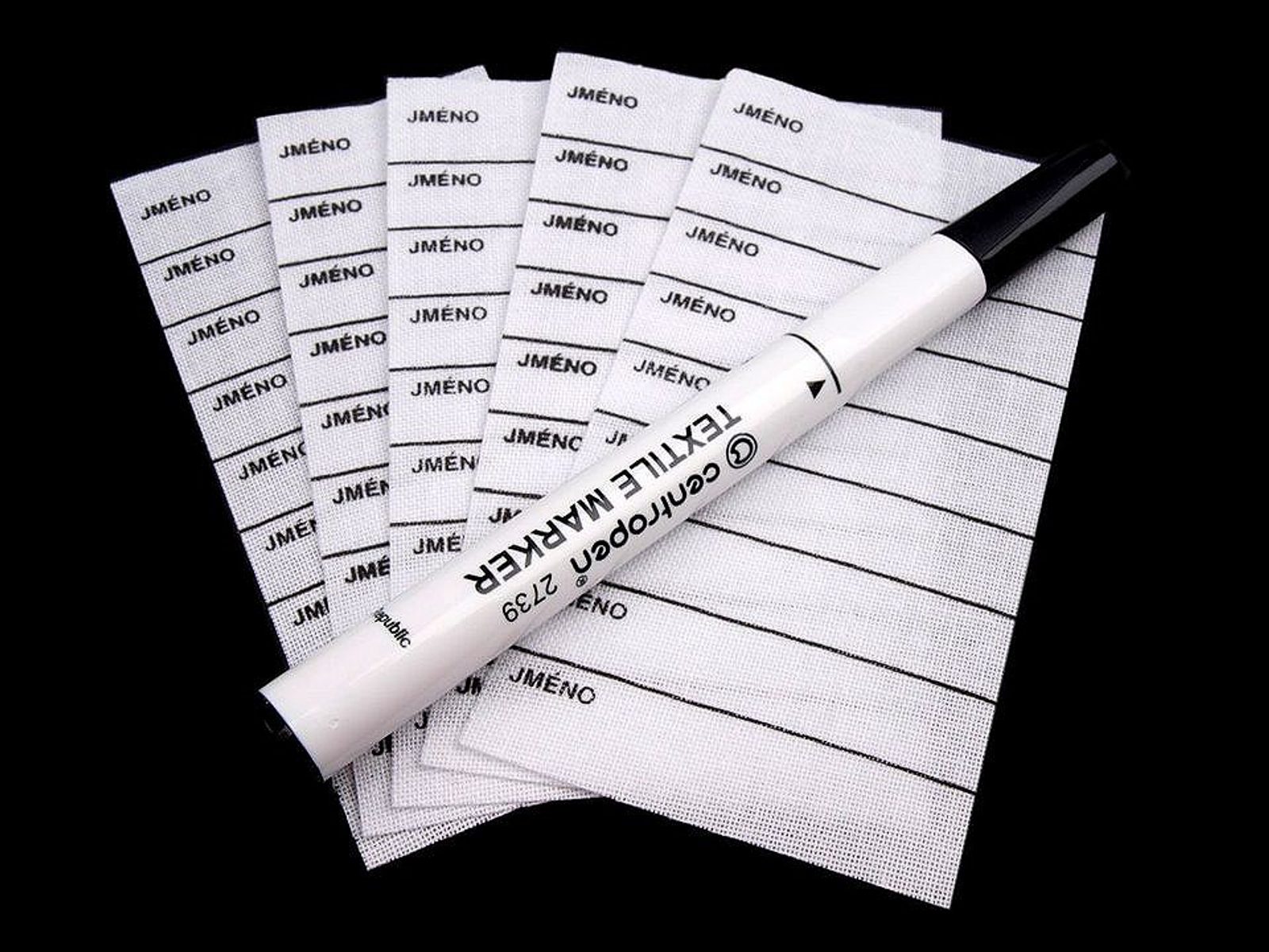 Nažehlovací štítek se lepí na oděvy tam, kde je potřeba vědět, čí který oděv je. Hlavně školky, školy, jesle, dětské domovy, nemocnice. Ale taky na prádlo nebo povlečení, které se dává do čistírny či na mandl. Lze na něj psát tužkou na textil. [Štítek doporučujeme i přišít, aby po praní nedošlo k jeho odlepení.] V jednom sáčku je 45 štítků. Rozměr jednoho štítku je: šíře 5,5 cm výška 1,5 cm. Rozměr celého plata je: šíře 5,5 cm výška 10,5 cm.Rozdíl mezi jednotlivými štítky je, že č. 1 je česká verze a č. 2 anglická verze.