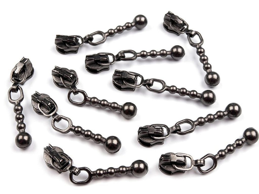 Kovový ozdobný jezdec má tvar tyčinky, kterou zakončuje kulička. Je s aretací, což znamená, že zdrhovadlo zůstává rozevřené pouze tolik, kolik si přejete.