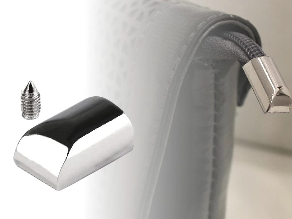 Elegantní kovovou koncovku využijete na zakončení zipu, převážně u kabelek nebo tašek. Schováte do ní nevzhledné konce a šroubkem je zespodu přišroubujete, aby koncovka nevypadla.