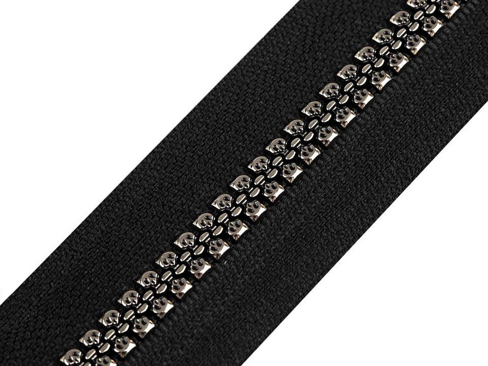 Kostěný zip v metráži má efektní zoubky s designem drobných lebek. Využijete ho na oděvy (mikiny, bundy, kabátky), kabelky, pouzdra nebo na výrobu zipových tašek.K tomuto zipu je vhodný jezdec, který najdete pod kódem 790301, 080728, 780026.