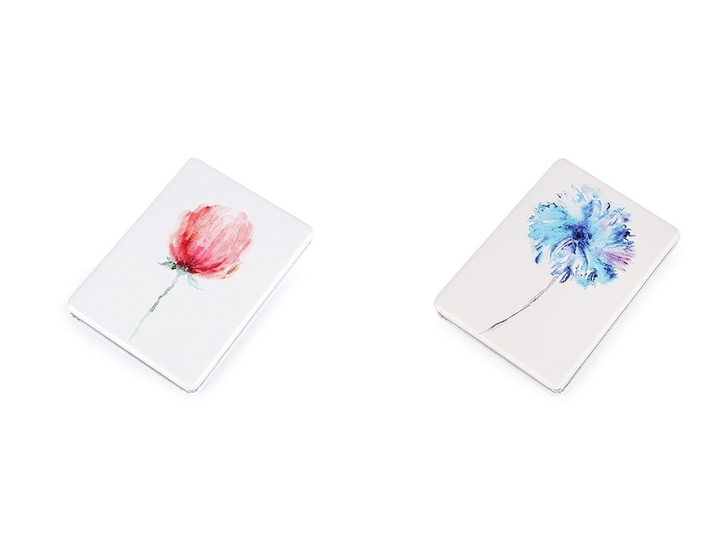 Stylové otevírací zrcátko s potiskem květiny, který připomíná akvarelovou malbu. Je výborný pomocník pro opravu make-upu během dne.Má kvalitní zpracování, je potažené eko kůží. Uvnitř jsou 2 zrcátka, jedno je zvětšovací.