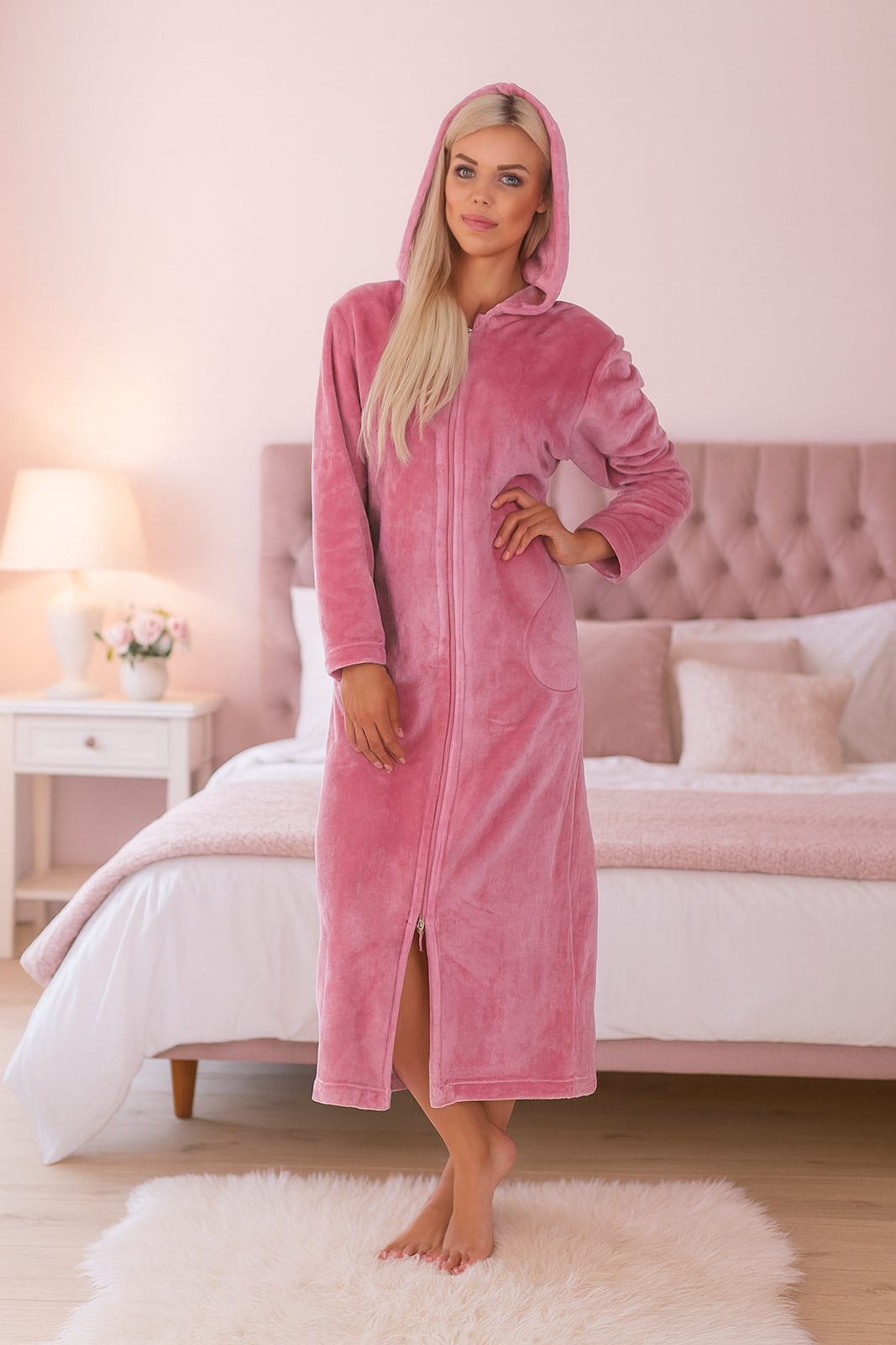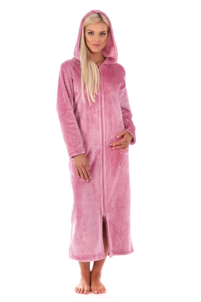 Pohodlný dámský dlouhý župan Siena na zapínání na zip v jemné pudrově růžové barvě. Župan pro ženy s kapucí, kapsami a zapínáním pomocí zipu.