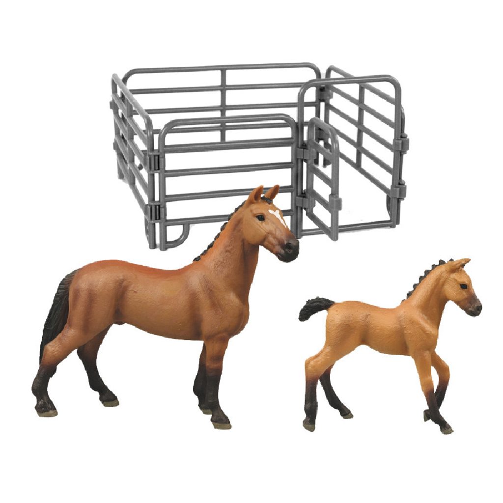 Figurka koně a hříběte v hnědé barvě s bílou skvrnou. Součástí balení také ohrada. Ideální pro milovníky koní. Tato hračka je součástí kolekce Moje malá farma.