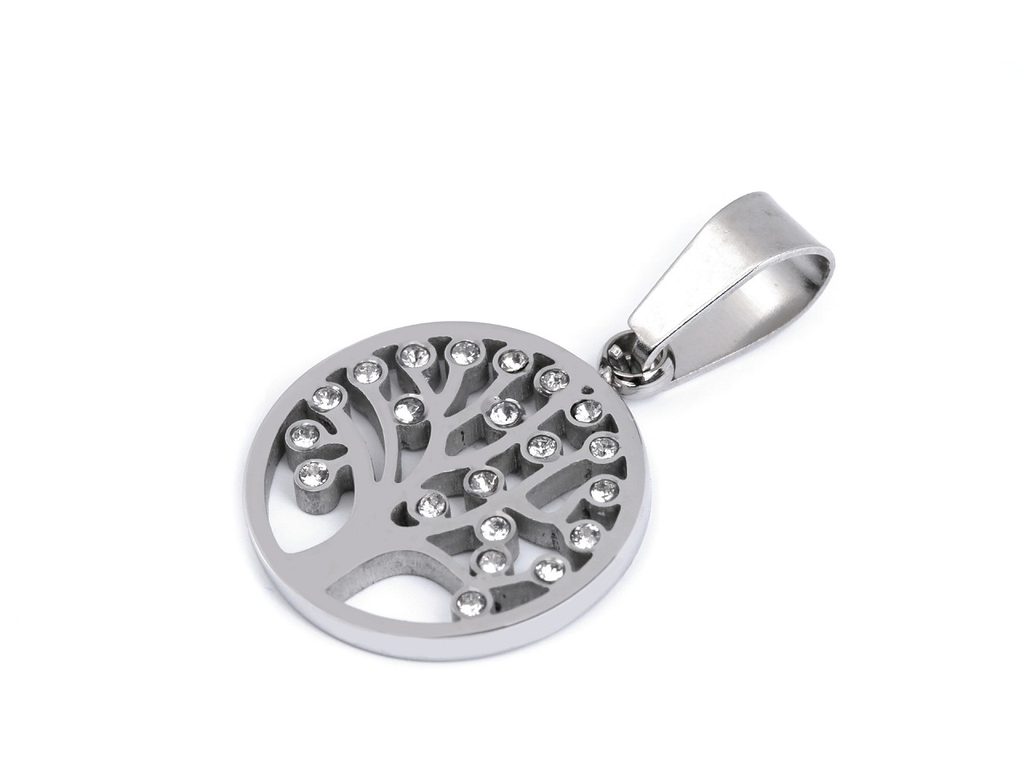 Přívěsek stromu života z chirurgické oceli je ozdobený drobnými třpytivými kamínky. Je decentní, ale zároveň efektní. Pozornost upoutá i svým vysokým zrcadlovým leskem.- Průměr:: 15 mm