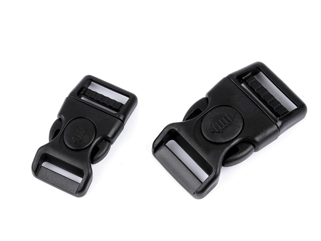 Plastová spona neboli trojzubec je odolná vůči mrazům a má pojistku proti samovolnému odepnutí. Díky mírně prohnutému tvaru skvěle poslouží na výrobu outdoorových náramků spletených ze šňůr. Využijete ji ale také k výrobě ledvinkových opasků, batohů, kabelek apod.